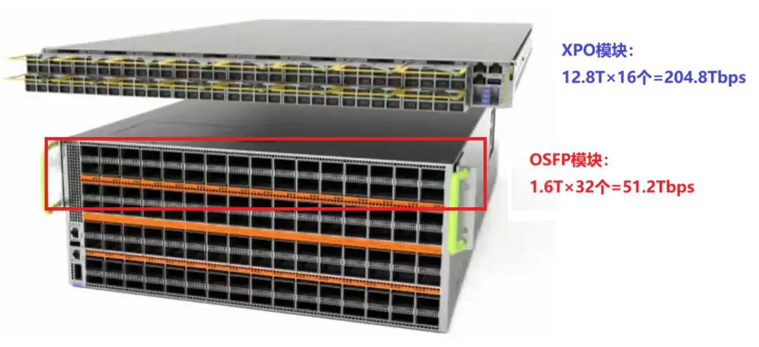 这种密度提升会带来翻天覆地的变化。在标准机架1U的空间里,原本最多能部署32个OSFP模块,总交换容量为51.2Tbps。而换成XPO,虽然只能放下16个模块,但总交换容量却暴增至204.8Tbps,依然是前者的4倍。