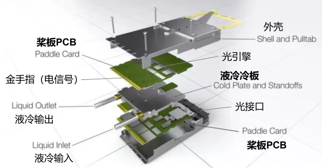 高密度必然带来高功耗和高热量,散热是首要挑战。XPO祭出了一套被称为“Belly-to-Belly(肚皮对肚皮)”的独特方案。它摒弃了传统的单块PCB板设计,转而采用两块独立的32通道PCB板(俗称“桨板”),像三明治一样将一块液冷冷板夹在中间。