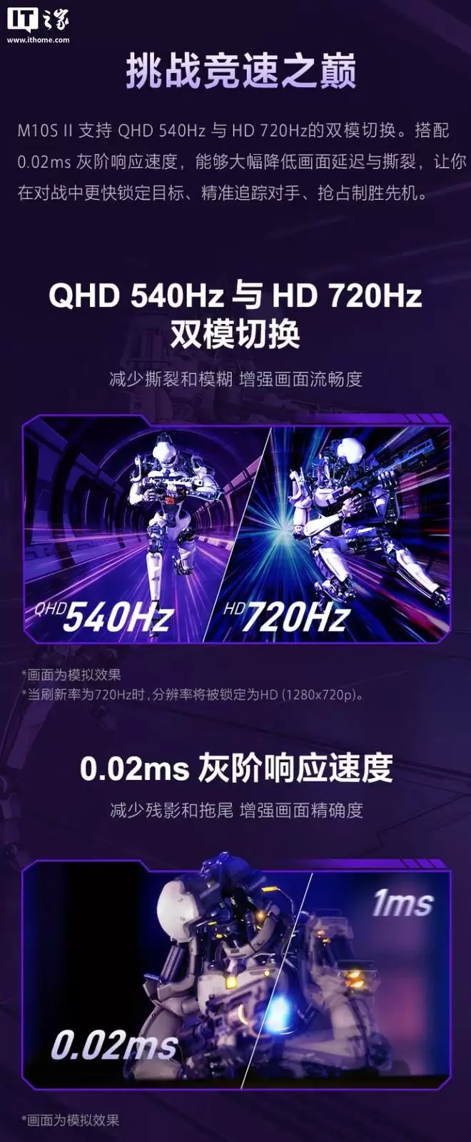 这款显示器来头不小,是由冠军电竞俱乐部Fnatic与索尼INZONE英纵联合打造的。它的核心卖点在于双模切换:既能在QHD(2560*1440)分辨率下跑到540Hz,也能切换到HD(1280*720)分辨率下冲击720Hz的极限刷新率。对于追求极致响应速度的职业选手或硬核玩家而言,这无疑提供了更灵活的选择。其灰阶响应速度达到了惊人的0.02ms,能大幅降低画面延迟与撕裂感。此外,新一代的动态模糊减少技术也安排上了,通过插帧算法来有效提升动态画面的清晰度,让高速移动的目标更加容易捕捉。