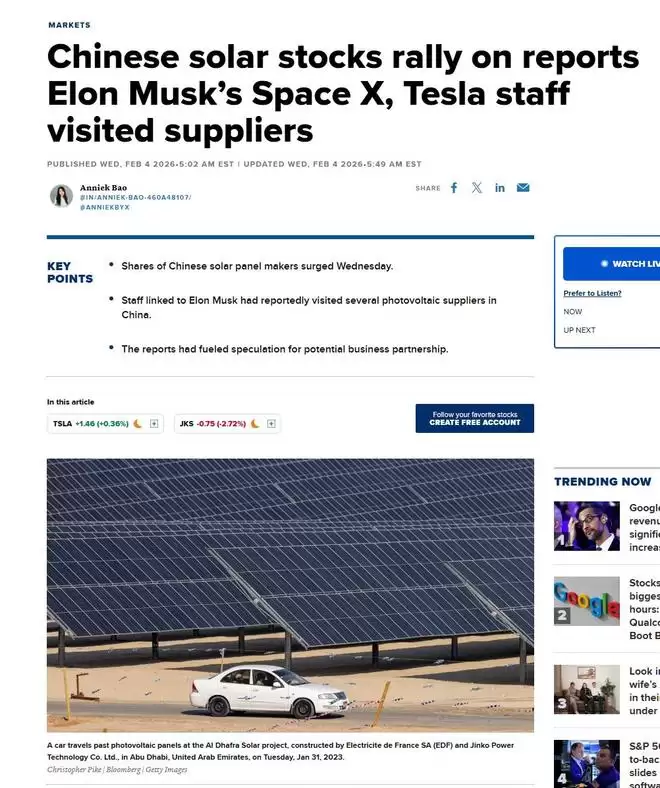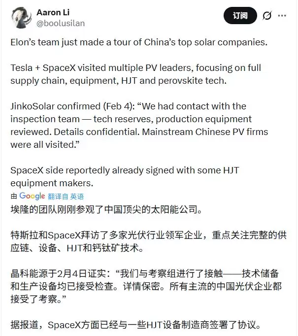 可以确定的事实是:据路透社及多家媒体证实,一支由SpaceX和特斯拉员工组成的“特使团”,近期确实秘密造访了数家中国光伏龙头企业。