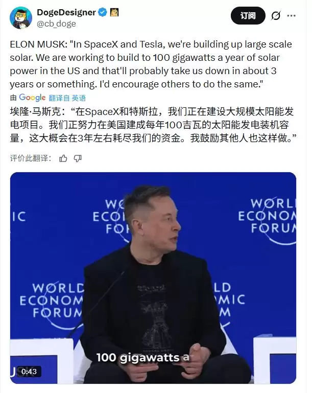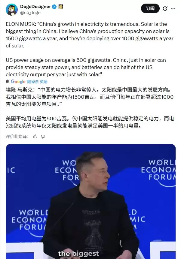 马斯克本人也毫不吝啬对中国的赞美。他在社交媒体上写道:“中国是惊人的制造强国,并且非常清楚太阳能是未来。这不容置疑!”