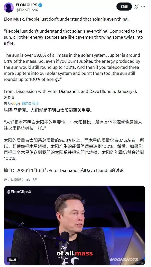 这还不是全部。马斯克的太阳能野心,早已突破了地球的边界。在与企业家彼得·迪亚曼蒂斯的一场对话中,他提出了一个更为震撼的愿景:“太阳能即一切”。他将其他能源比喻为“原始人向火堆扔柴火”,认为只有太阳能,才是未来所有能源系统的基石。
