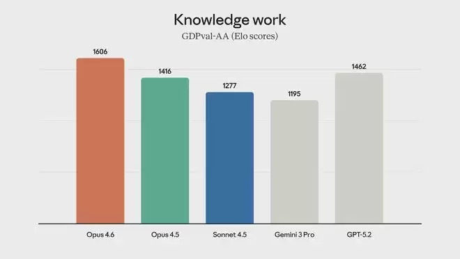 在衡量金融、法律等高价值知识工作任务的指标GDPval-AA上,Opus 4.6展现出了惊人的统治力:比前代Opus 4.5提升了190个Elo分;比竞争对手OpenAI的GPT-5.2更是高出约144个Elo分。