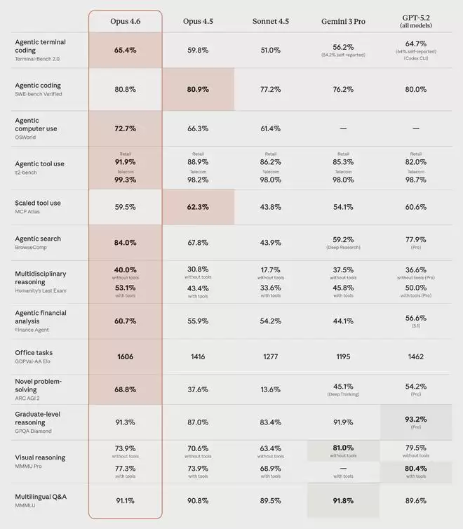 据Anthropic官方称,Opus 4.6在智能体编程、计算机使用、工具使用、搜索和金融领域均属行业领先,且通常具备显著优势,部分基准测试更是大幅领先业内对手。