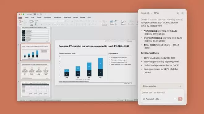 Anthropic深知,金融和知识工作者的战场在Office家族。Opus 4.6的Excel插件以及PPT插件能自动推断杂乱表格的逻辑,甚至能读取你公司的PPT母版和字体,直接生成一份符合品牌要求的路演PPT。