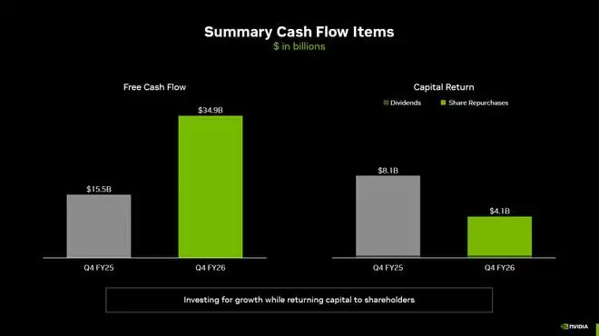 2026财年全年,英伟达通过股票回购(401亿美元)和现金派息(9.74亿美元),累计向股东返还了411亿美元。截至第四财季末,公司账面现金及现金等价物高达626亿美元,且仍手握585亿美元的剩余回购授权额度。如此丰沛的现金流,赋予了英伟达极强的抗风险能力,使其能在保证高强度研发投入的同时,持续对冲二级市场的波动。