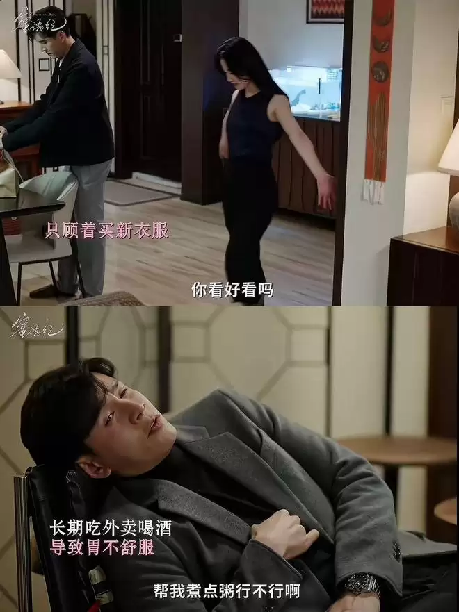 应酬频繁、胃病缠身的聂予诚,在胃痛发作时恳求鲁贞贞煮碗粥,得到的却是冷冰冰的回应。鲁贞贞直接让他点外卖,并嫌弃地表示自己不是他的保姆,真需要人可以雇佣人。此刻的聂予诚,恐怕才在疼痛中想起许蜜语往日的好,只是后悔已然太迟。