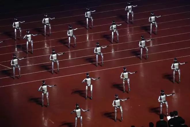 2026年江苏省城市足球联赛开幕式上的机器人队列表演。图源东方IC