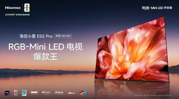4月22日,海信电视2026小墨E5系列新品发布会如期举行。这次亮相的主角有两款:RGB-Mini LED电视小墨E5S Pro,以及Mini LED电视小墨E5S。两款产品均覆盖了55英寸、65英寸、75英寸、85英寸和100英寸这五个市场公认的黄金尺寸,并将于5月20日在全网正式开售。