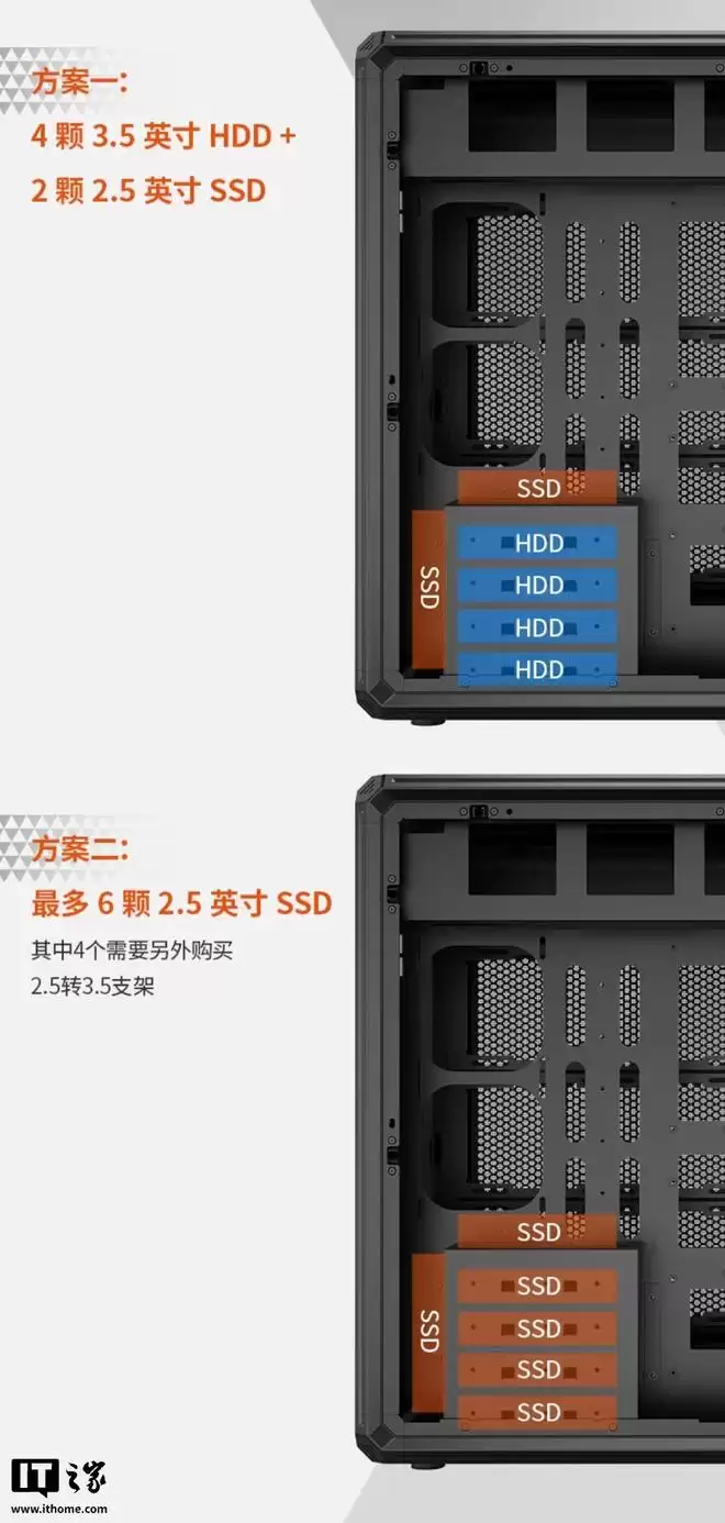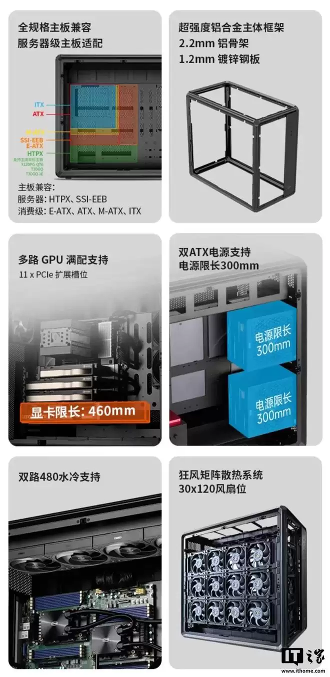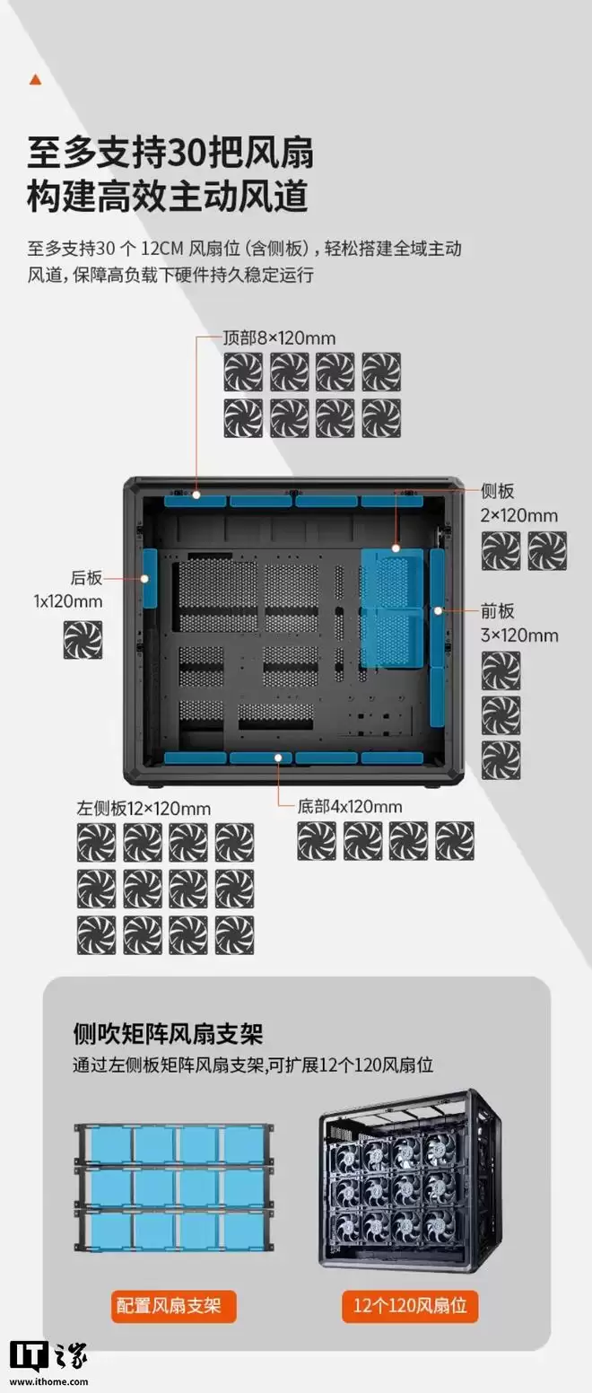 散热系统设计是南岳SR700的另一大亮点。机箱总计支持安装多达30个120mm风扇,具体布局为:前面板3个(支持360mm冷排)、侧板2个、底部4个、左侧板12个、后板1个以及顶部8个(支持双480mm冷排)。用户还可通过选配额外风扇支架,进一步增加12个风扇安装位。这种极致的风道规划与散热冗余设计,专为高功耗硬件平台的极限散热与高效静压风道优化。
