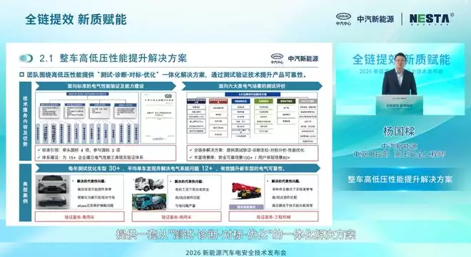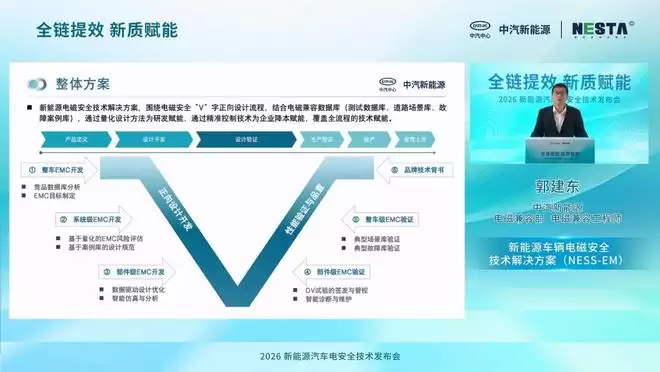 发布会上重磅推出的新能源汽车电安全解决方案(NESS),正是从整车产品开发的全流程入手。它系统性地覆盖了“对标分析与目标分解”、“系统与部件设计验证”、“整车技术验证”、“产品力提升”四大关键环节,贯穿充放电性能、电磁兼容、高低压性能、整车热管理、动力电池等多个专业技术领域。其核心目标,是与车企深度协同,共同提升产品品质与安全基准。