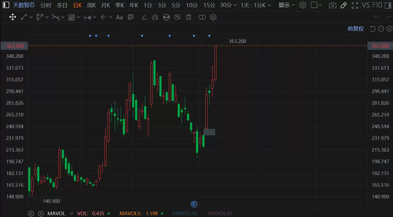 港股市场今日迎来显著亮点。中国通用GPU与人工智能算力方案商天数智芯(9903.HK)股价强势上扬,单日涨幅突破15%,收报363.2港元,创下上市以来历史最高纪录。尤为引人注目的是,其股价在过去一个月内累计涨幅已超70%,公司总市值也随之站上920亿港元的新台阶。