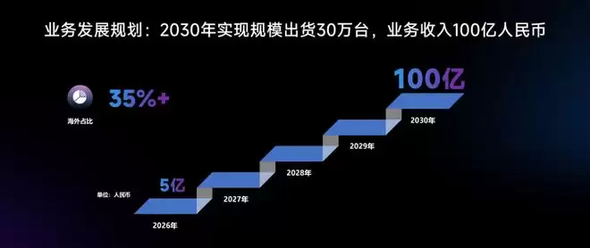 四足机器人赛道正展现出强劲增长。邱恒透露,智元酷拓今年一季度的销售规模已超过去年全年,增长曲线陡峭。公司预计,到2030年将实现年出货30万台、营收100亿元的目标,其中海外市场收入占比将超过35%。