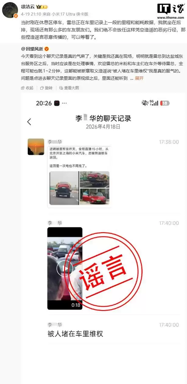徐洁云在回应中详细描述了当时的情景:车辆刚在休息区停稳,雷军正在车内专注地记录上一段行程的里程与能耗数据,而他本人就坐在后排座位上,现场还有许多同行的车友可以作证。徐洁云明确表示,公司绝不会对这类凭空捏造的恶劣行径坐视不管,那些制造并恶意传播谣言的人可以“等着了”。这番表态,已然为此次公司层面的正式声明与法律行动埋下了伏笔。