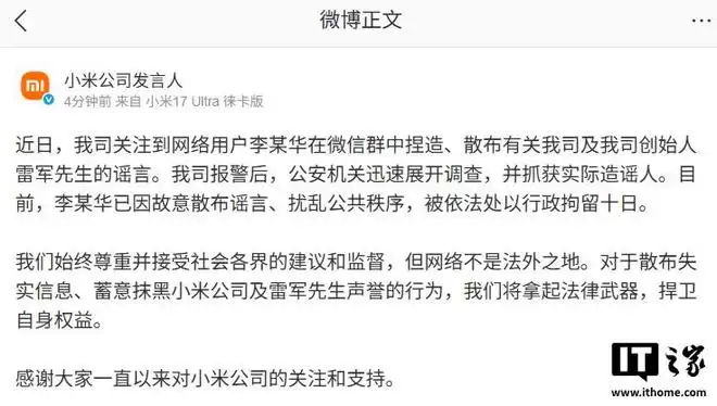 近日,我司关注到网络用户李某华在微信群中捏造、散布有关我司及我司创始人雷军先生的谣言。我司报警后,公安机关迅速展开调查,并抓获实际造谣人。目前,李某华已因故意散布谣言、扰乱公共秩序,被依法处以行政拘留十日。 我们始终尊重并接受社会各界的建议和监督,但网络不是法外之地。对于散布失实信息、蓄意抹黑小米公司及雷军先生声誉的行为,我们将拿起法律武器,捍卫自身权益。 感谢大家一直以来对小米公司的关注和支持。