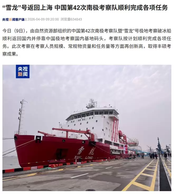 4月9日,“雪龙”号极地考察破冰船安全抵达中国极地考察国内基地码头,宣告由自然资源部组织的中国第42次南极考察队主力队员成功返回。此次考察在任务复杂性、物资投送规模及参与人员数量上均创下新高,其系统性成果标志着我国极地科学考察能力实现了又一次关键跃升。