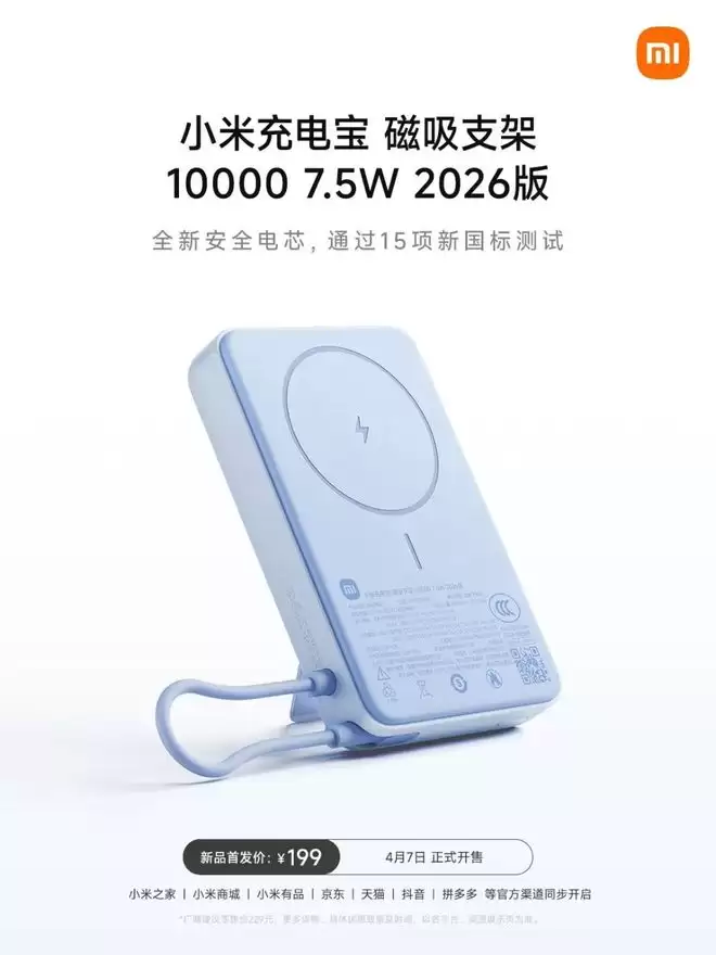 行动已见成果:小米同步推出了首款践行新规理念的产品——小米充电宝 磁吸支架 10000 7.5W 2026版。该产品采用全新安全电芯,据称已通过15项新国标测试。其搭载的新一代安全电池具备12项保护设计,并新增智能状态读取功能。创新的支架设计兼容磁吸与有线两种充电模式,兼顾安全与实用。