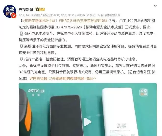 一项直接影响消费者用电安全的强制性国家标准正式发布。由工业和信息化部等部门联合制定的《移动电源安全技术规范》(GB 47372—2026)已公布,并将于2027年4月1日强制实施。此举标志着移动电源产品的安全基准将迎来一次系统性重构。