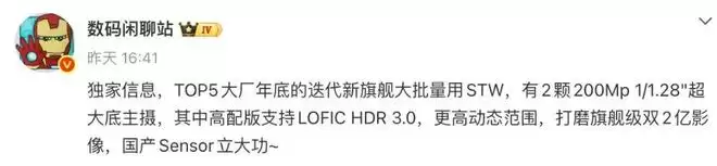 将视线投向更远的技术前沿,小米后续数字旗舰系列也透露出新的影像技术风向。据数码博主@数码闲聊站 爆料,头部厂商年底的迭代旗舰将大规模采用STW技术,并搭载两颗200Mp 1/1.28英寸超大底主摄传感器。其中高配版本将进一步支持LOFIC HDR 3.0技术,以实现更高的动态范围,目标打造“旗舰级双2亿像素影像系统”。爆料中提及“国产Sensor立大功”,虽未明确指向具体系列,但行业普遍推测这很可能应用于小米18系列。