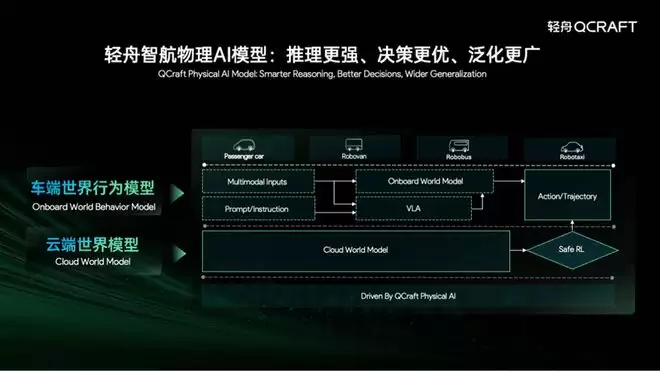 这场发布会信息量十足:基于“世界模型+强化学习”统一架构的物理AI模型重磅亮相,云端与车端双引擎首次完整发布;超500TOPS算力的“轻舟乘风MAX”极致城市NOA方案同步推出;L4级Robotaxi与Robovan的最新进展也得以披露。可以说,轻舟智航在北京车展完成了从自动驾驶迈向通用物理AI的关键一跃。