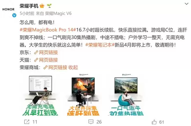 更亮眼的是其能效表现——全系标配 92Wh 大容量电池的 MagicBook Pro 14,在荣耀实验室标准测试环境下,最长续航达到了史无前例的16.7小时,在多项综合续航实测中全面超越了同尺寸的苹果 MacBook Pro 14,可谓重塑了 Windows 轻薄本的续航标杆。