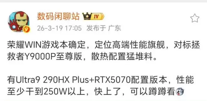 而在瞄准硬核发烧友的顶级领域,荣耀 WIN 游戏本则直接将目标锁定为行业标杆联想拯救者 Y9000P 至尊版。据悉,其顶配版本将搭载强悍的 Ultra9 290HX Plus 处理器与 RTX 5070 显卡组合。最让人咋舌的是,在重构的散热架构支撑下,整机性能释放预计将突破 250W 大关。这个数字,已经清晰表明了其冲击性能天花板的野心。