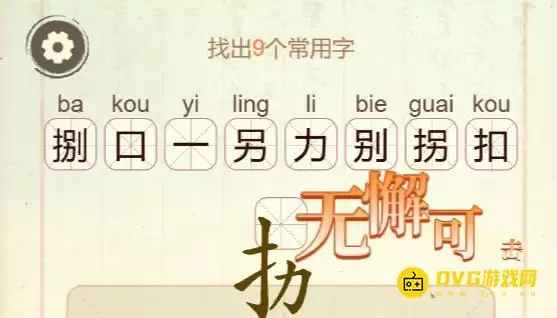 2、最后一个字是:这往往是破关的关键。当你找出了八个字,可能就卡在最后一个上。这时候需要一点联想,看看还有哪个部件能独立成字。比如,“捌”字右上角的那个“丿”(撇),它本身就是一个汉字。当然,具体是哪一个,咱们看答案来验证。