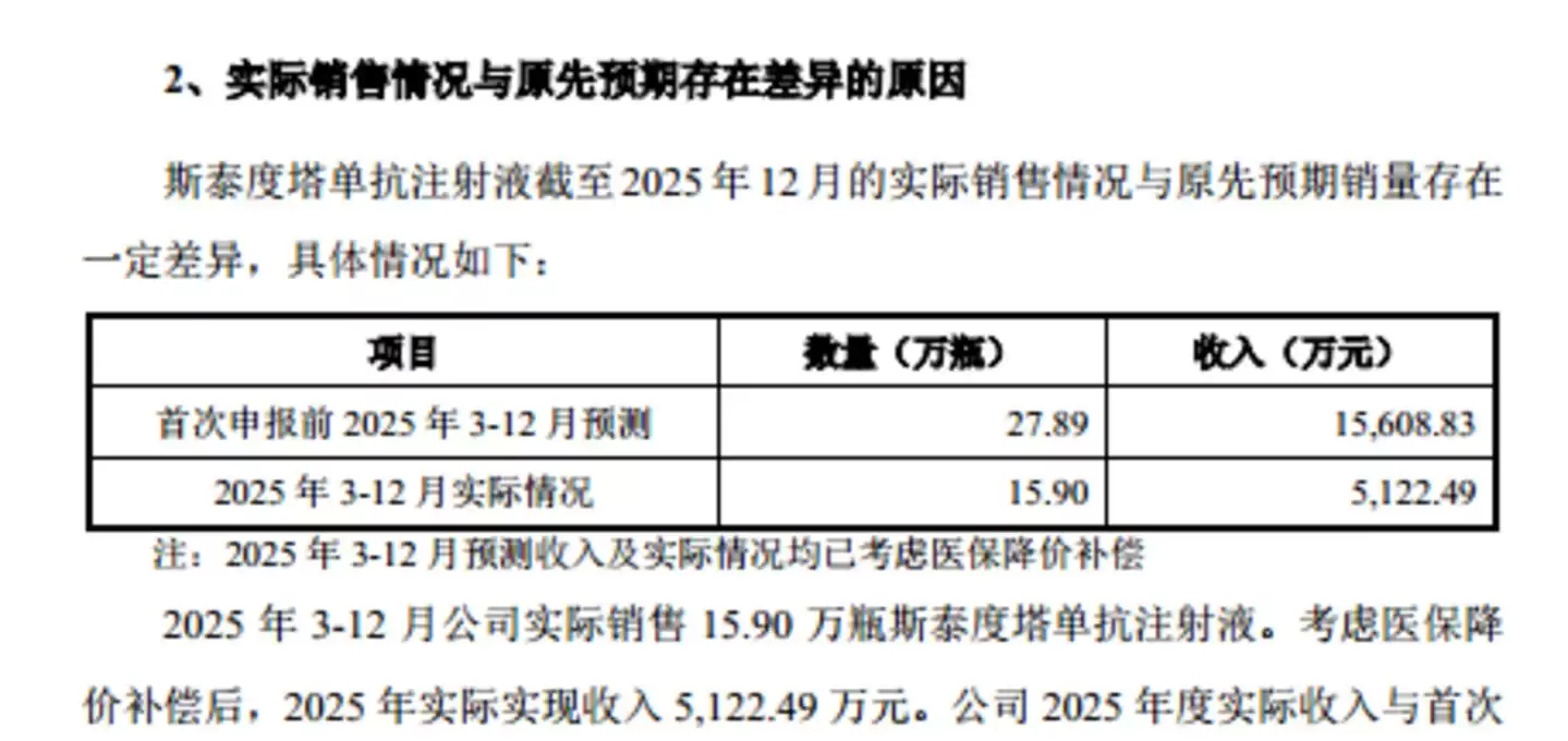 审视其2023年至2025年的营收轨迹:0元、1505.59万元、5122.49万元。直至2025年2月,其核心产品斯泰度塔单抗注射液在国内获批,公司才真正步入产品商业化阶段。值得注意的是,在该产品上市前,公司曾给出乐观预测,预计2025年3-12月实现销量27.89万瓶,对应收入1.56亿元。但实际市场表现远逊于预期,同期实际销量为15.9万瓶,实现收入5122.49万元,终端销售数据与前期预测存在显著差距。