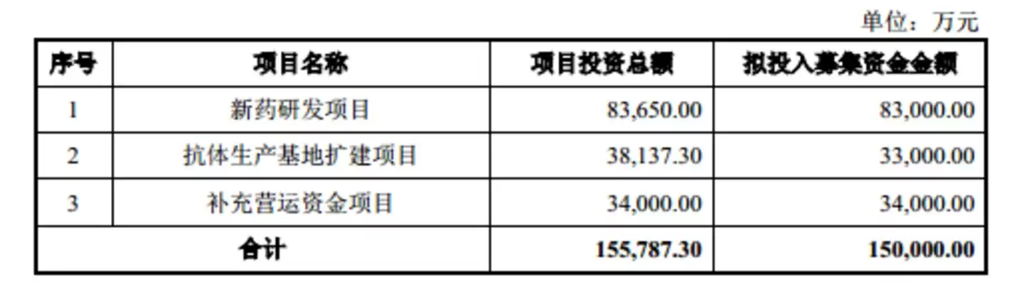 本次IPO,泰诺麦博计划募集资金15亿元,投向新药研发、抗体生产基地扩建及补充营运资金,具体分配比例如下图所示: