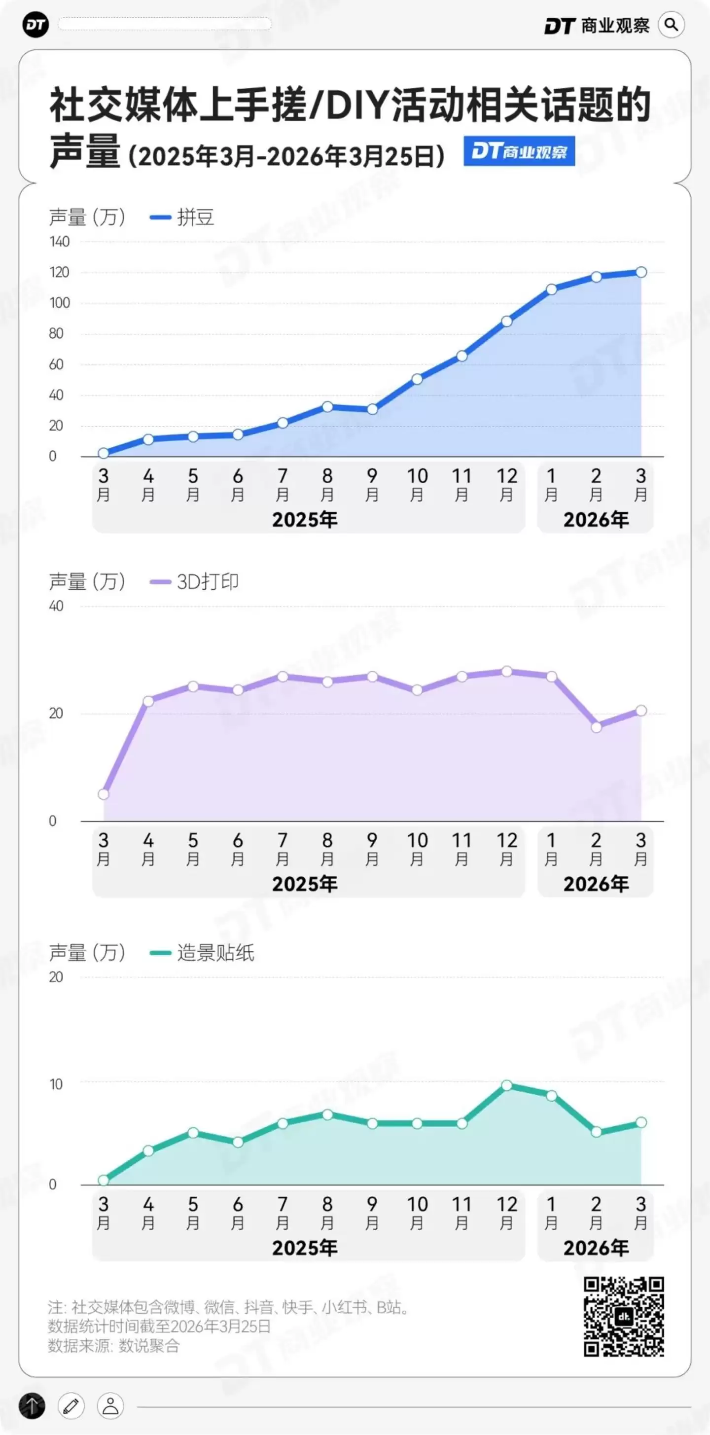 具体数据支撑了这一观察。从2025年3月到2026年3月,拼豆的社交媒体声量从2.1万激增至120.4万,增幅接近60倍;3D打印的月均声量稳定在20万以上,拥有坚实的用户基础;而起步较晚的造景贴纸,也在2025年底迎来了显著的声量增长。