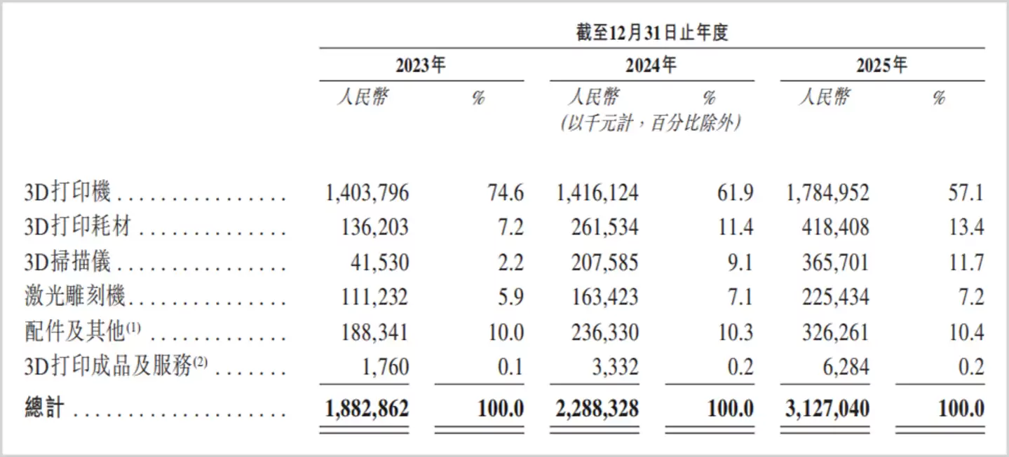 为应对竞争,创想三维正推进业务多元化。除核心3D打印机外,耗材、3D扫描仪、激光雕刻机等业务线均在拓展。2025年,3D打印机收入占比已降至57.1%,耗材与3D扫描仪业务增长较快,占比均提升至10%以上。