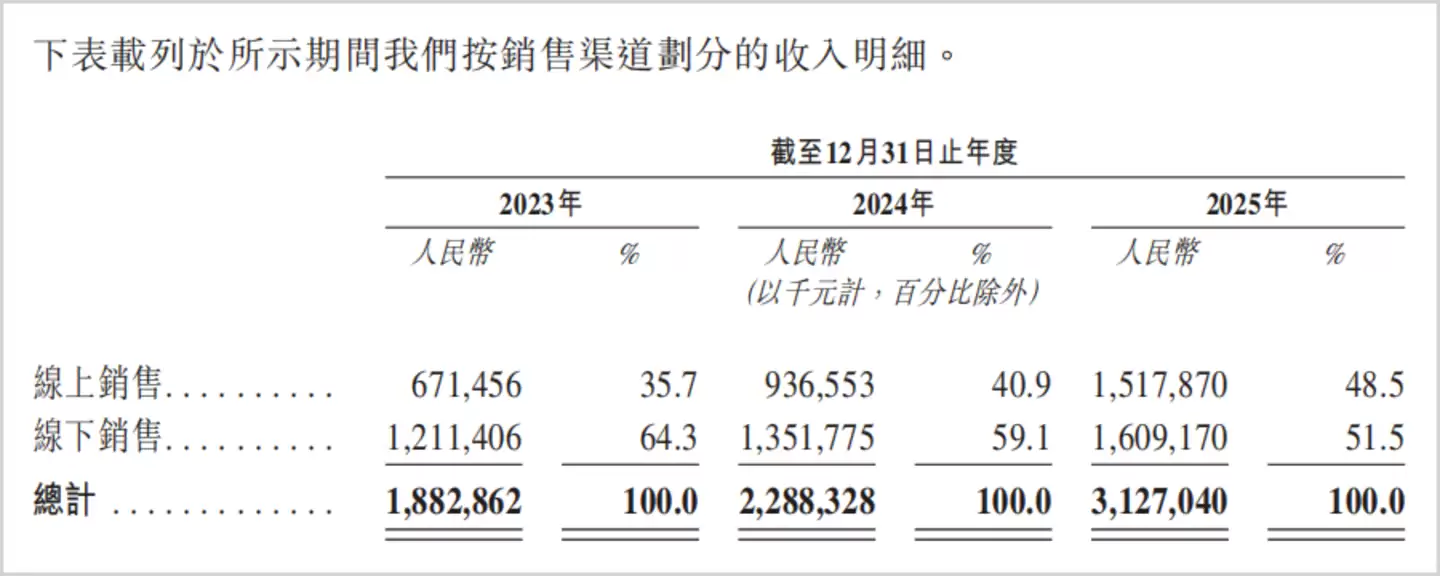 数据印证了渠道结构的变化:2024年至2025年,线上渠道收入从6.71亿元翻倍至15.18亿元,占比从35.7%提升至48.5%;同期线下收入增速则相对平缓。