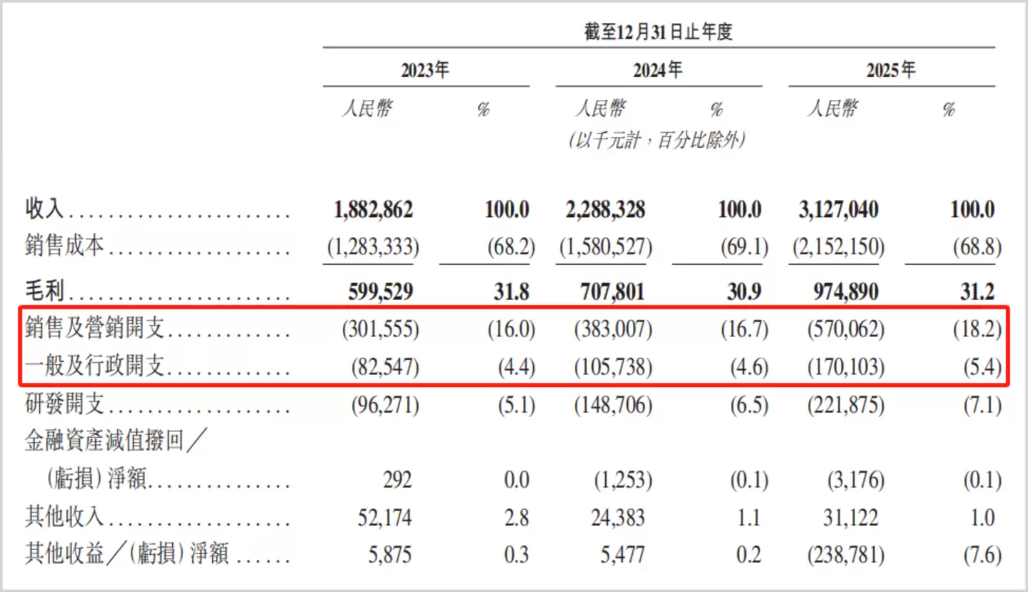 招股书数据显示,营销费用是挤压利润的主要因素。该项开支从2024年的3.01亿元激增至2025年的5.7亿元,占营收比重也从16%上升至18.2%。