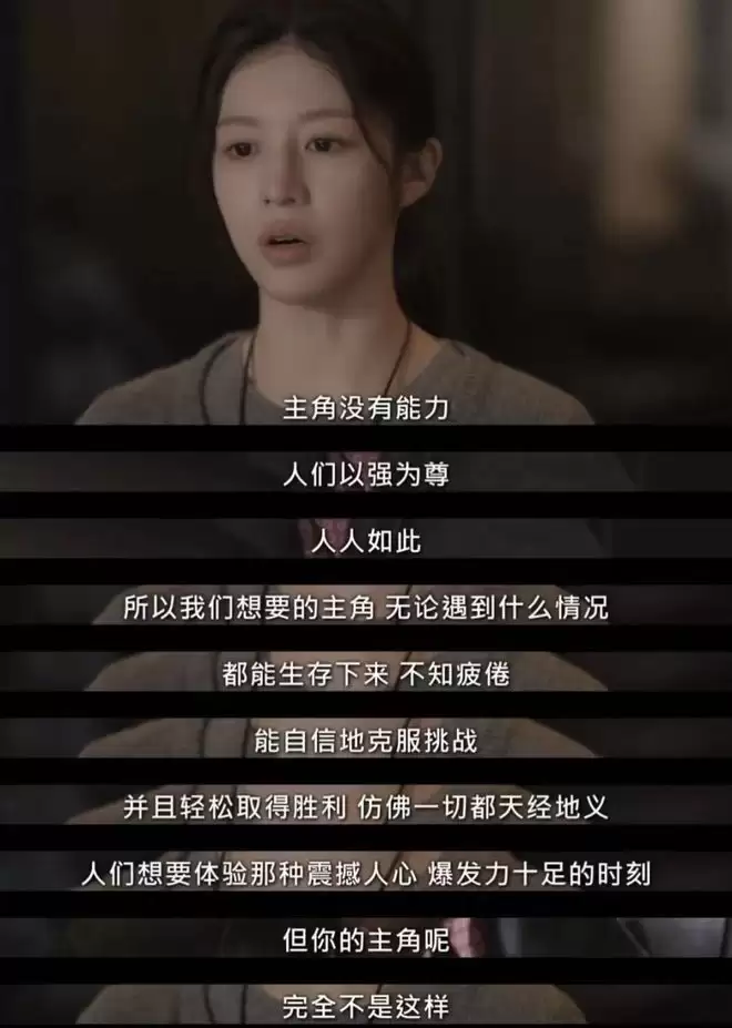 她是这样说的:“人们向来崇尚强者,无一例外。所以我们期待的主角,无论遇到什么困境都能生存,不知疲倦,能自信地克服一切挑战,并且轻松取胜,仿佛这一切都天经地义。观众渴望体验那种震撼人心、爆发力十足的瞬间。但你的主角呢?完全不是这样。你应该创造一个有能力的人。为什么你没做到?因为作者本身也没有能力。一个创造者,无法创造出自己不具备的东西。”