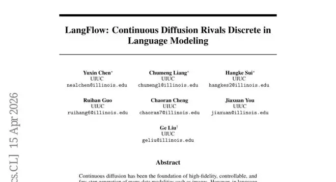LangFlow:连续扩散语言模型,这次真的行了 这项由美国伊利诺伊大学厄巴纳-香槟分校(UIUC