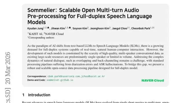 A:Sommelier是由KAIST和NA VER联合开发的音频预处理系统,专门用于处理真实对话中的复杂情况。它能分离多人同时说话的音频、识别不同说话人、去除背景音乐并生成准确的文字转录。其角色类似于专业的音响工程师,能从混杂的录音中提取清晰的对话内容,为训练更自然的对话AI提供高质量数据。