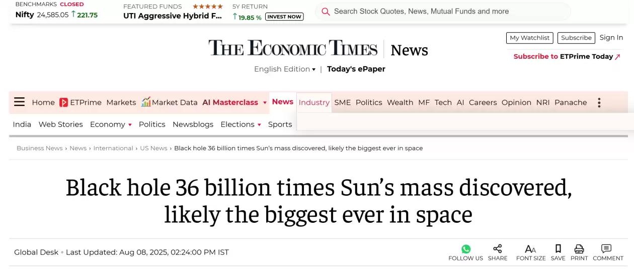 天文学观测新高度:捕获质量达太阳363亿倍的“极限”黑洞 天文学界近期取得一项里程碑