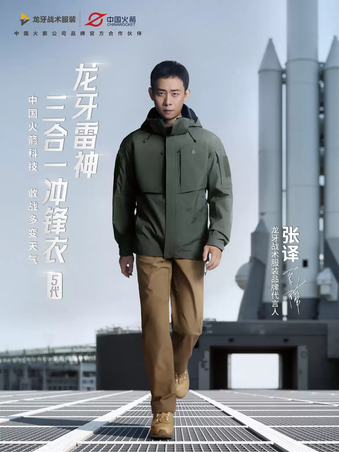 发布会现场,两款源自航天技术的核心材料首次亮相:“火箭棉”与“星伞甲”。前者聚焦极致锁温,后者主打超强耐磨,精准回应户外及战术场景的功能痛点。同时,龙牙再次确认演员张译为品牌代言人,并重磅推出联名款“张译同款”——龙牙雷神三合一冲锋衣5代。该产品集成两大航天材料,并延续战术服装标志性的立体剪裁、模块化内胆接驳与大装载设计,旨在为用户应对复杂气候与多变活动提供可靠保障。