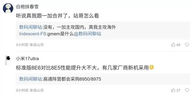 讨论核心很快回归芯片性能。用户直接追问迭代提升与采用情况:“标准版8E6相比8E5性能提升幅度如何?有哪些厂商将采用?”爆料指出:“高通阵营厂商将普遍采购8950/8975平台。”这意味着新一代旗舰SoC将继续成为安卓高端机型的统一选择。