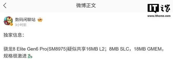 疑似骁龙8 Elite Gen6 Pro (SM8975) 将共享16MB L2缓存;配备8MB SLC及18MB GMEM,整体规格设计相当激进