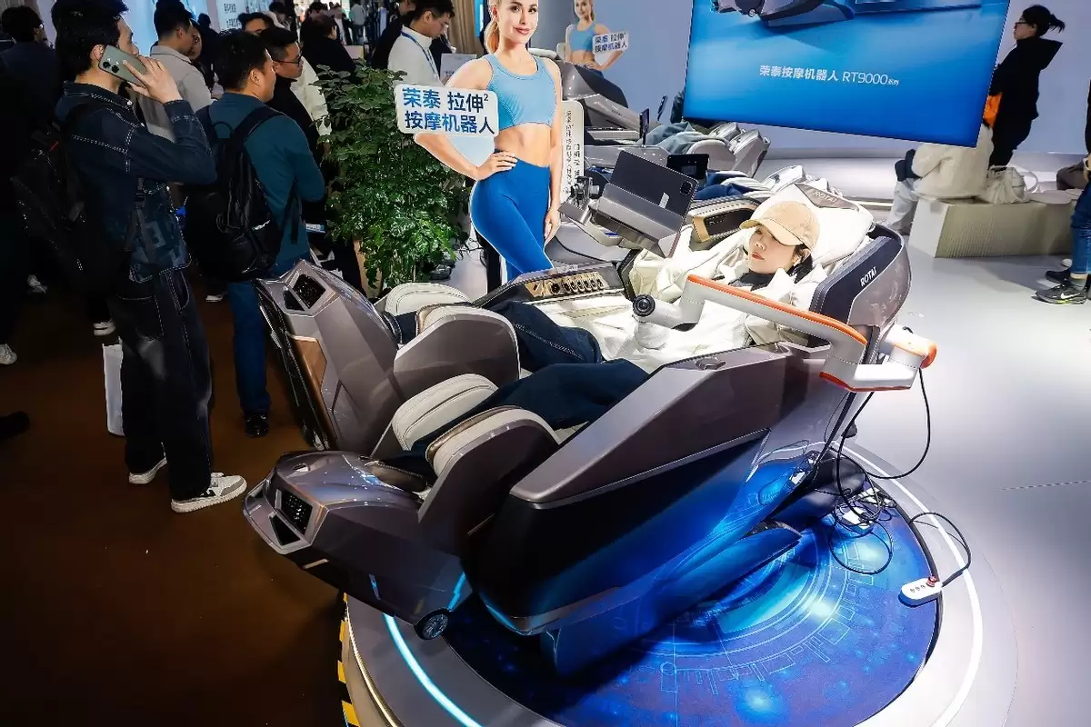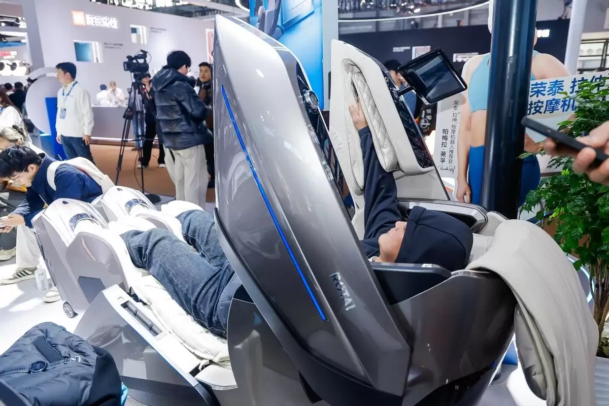 在荣泰健康的展台中央,全新RT9000系列按摩机器人无疑是视觉与技术的双重焦点。其独特的双手双脚独立结构,突破了传统按摩椅的形态框架,宛如一台精密的健康机甲,吸引了大量观众驻足体验。展区前排起的长队,直观印证了市场对这款革新产品的热切关注。
