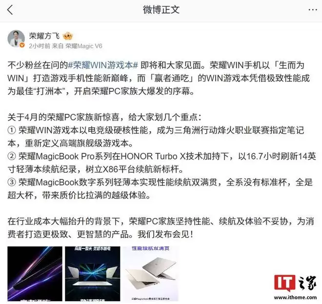 方飞同步梳理了本月荣耀PC的核心产品信息,要点明确: