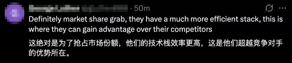 市场显然读懂了背后的信号。在DeepSeek官方账号的推文下,一种主流观点认为,这无疑是DeepSeek凭借技术优势,在强势抢占市场份额。当技术领先辅以价格利器,攻势自然凌厉。
