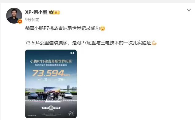 4月27日,小鹏集团董事长何小鹏通过微博发布了一条消息,核心内容很明确:祝贺小鹏P7成功挑战了一项吉尼斯世界纪录。他在分享中特别指出,这次“73.594公里连续漂移”的壮举,本质上是对P7车型底盘与三电技术的一次扎实、有力的验证。