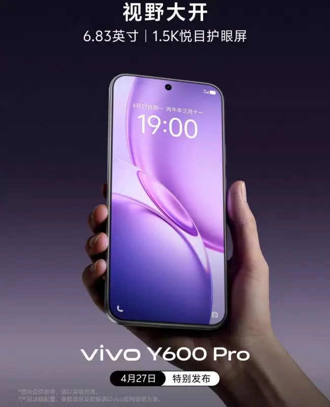 更引人注目的是屏幕部分。根据预热信息,vivo Y600 Pro 将配备一块 6.83 英寸的 1.5K 护眼屏(具体分辨率数值官方暂未公布)。关键是海报展示的正面观感——它采用了一块四边等窄的直屏。要知道,“四边等窄”一直是提升正面视觉沉浸感的关键,也是不少用户心心念念的设计,这次在 Y 系列上出现,算是个不小的看点。