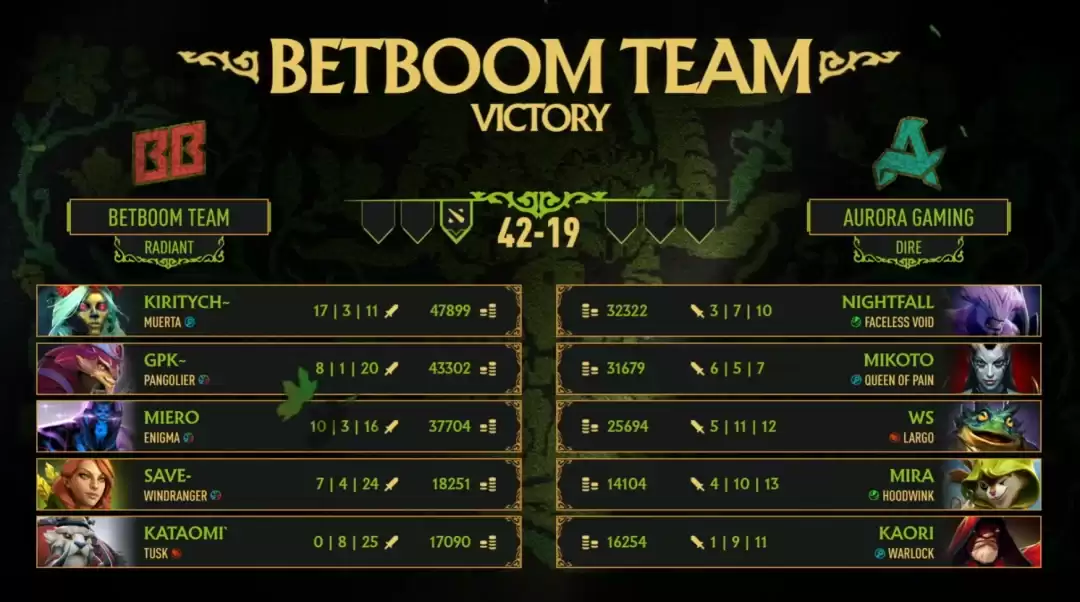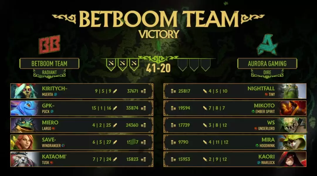 总决赛首局,BB从对线期开始就掌握了主动权。度过对线期后,他们在攻防两端都占据了上风,几波关键团战的人头交换都赚得盆满钵满,经济优势迅速滚起雪球。中期,即便面对Aurora的团战反扑,BB也表现得异常冷静。队内三号位的谜团多次贡献出决定战局的“黑洞”,帮助队伍连续赢团并控制肉山,最终通过抓人上高,稳稳拿下第一局。