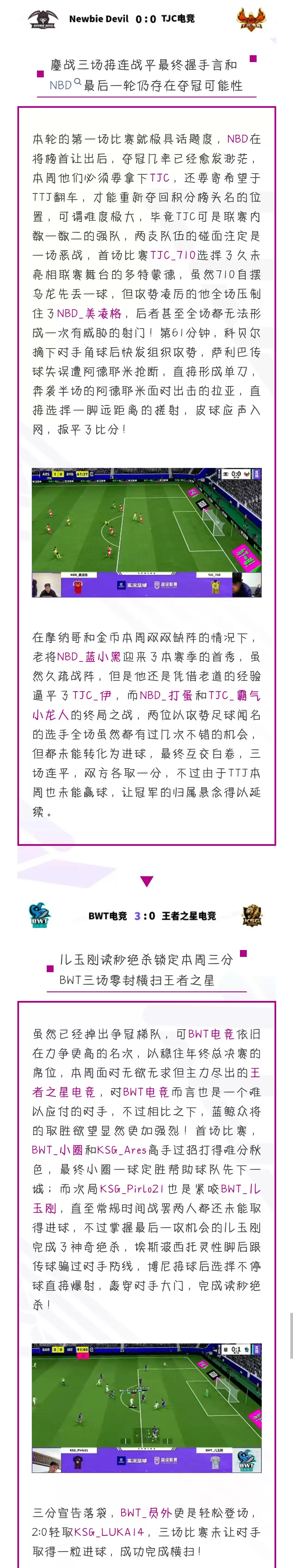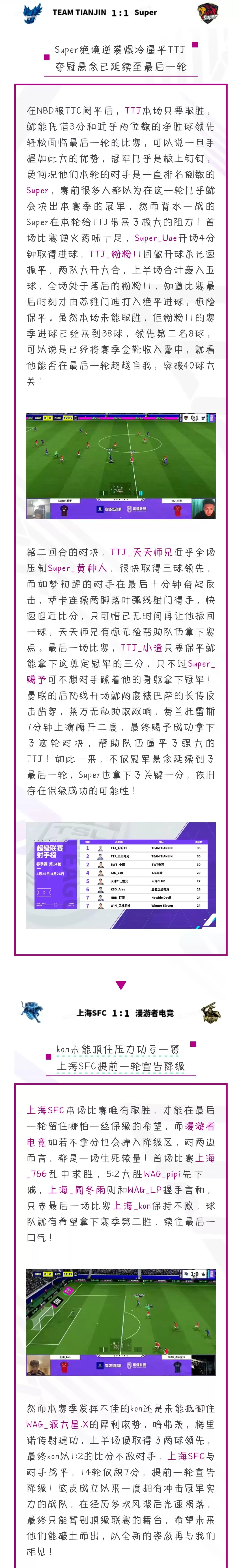 争冠集团这边,局面可谓一波三折。NBD与TJC的直接对话,最终以一场平局收场,谁也没能彻底扼杀对方的希望。而更令人意外的,是领头羊TTJ竟被身处保级区的Super战队顽强逼平。这两场平局,像是一道精准计算的公式,将冠军的悬念完美地保留到了最后一轮。现在,两支球队的命运依然掌握在自己手中,最终的对决,就看谁能顶住压力,笑到最后了。
