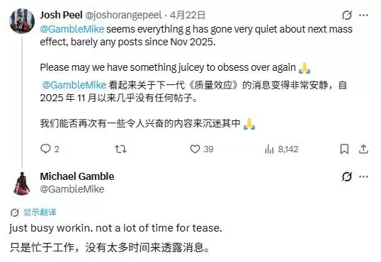 BioWare 项目总监 Michael Gamble 在 X 上回复网友时提到,其团队正在全力开发《质量效应 5》,
