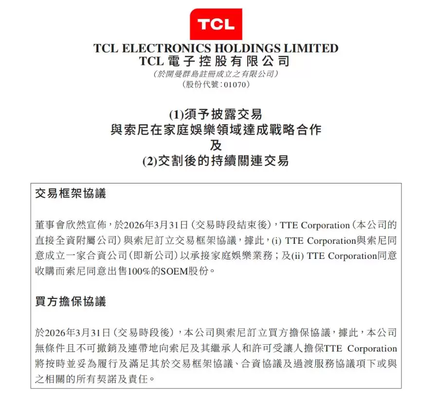 传闻已久的交易终于尘埃落定。根据The Verge在3月31日的报道,索尼已正式宣布,TCL将以约75.4亿日元的价格收购其电视业务,双方将共同成立一家名为Bra via Inc的新合资公司。协议细节很清晰:TCL将持有新公司51%的多数股权,索尼则保留49%的股份。