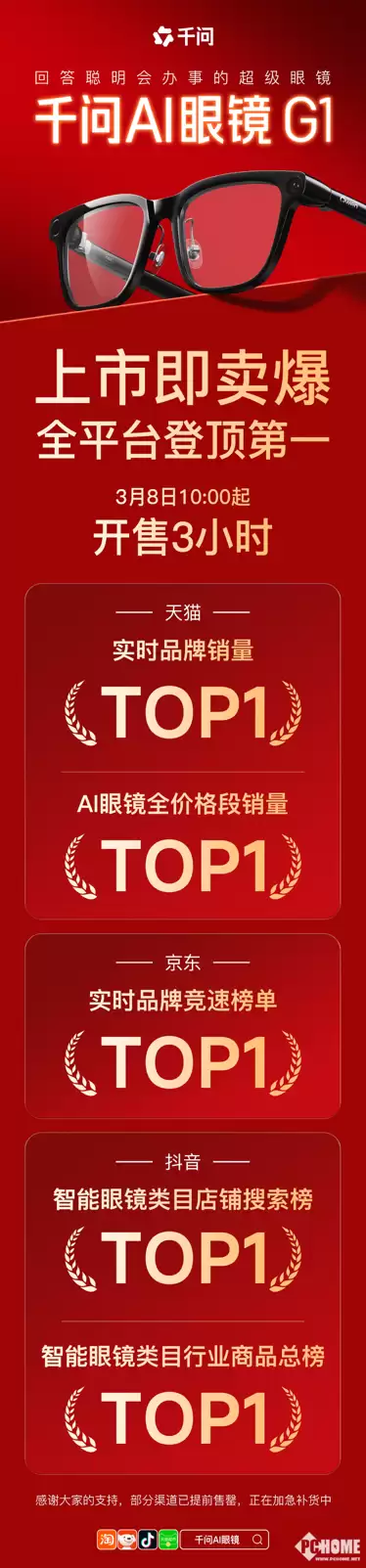 卖爆了!千问AI眼镜G1开售3小时全平台登顶第一